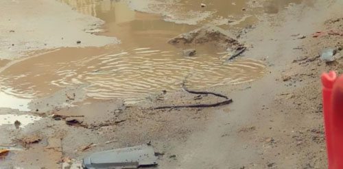 市民所反映的電線(xiàn),呈現(xiàn)在北園路潮師路段。現(xiàn)場(chǎng)可見(jiàn)水坑里泡著一截電線(xiàn),通過(guò)往車(chē)輛碾壓,部分外皮現(xiàn)已裂開(kāi),顯露電線(xiàn)結(jié)構(gòu)。