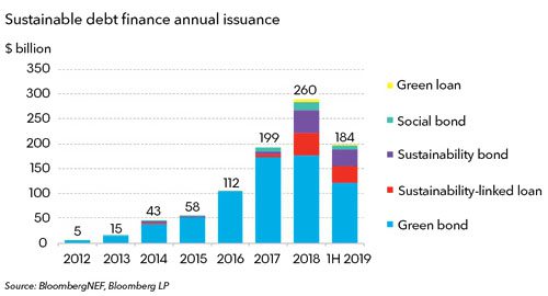 本年上半年,全球可繼續(xù)債款融資體現(xiàn)搶眼,創(chuàng)下新的紀(jì)錄,到達(dá)1840億美元,包含綠色債券,綠色借款,可繼續(xù)借款等。一般來(lái)說(shuō),上半年的體現(xiàn)比下半年安靜。所以,即便2019年終究六個(gè)月的發(fā)行利率堅(jiān)持不變,估計(jì)全年至少可以獲得3800億美元的可繼續(xù)債款融資,2018年全球可繼續(xù)債款融資達(dá)2600億美元。